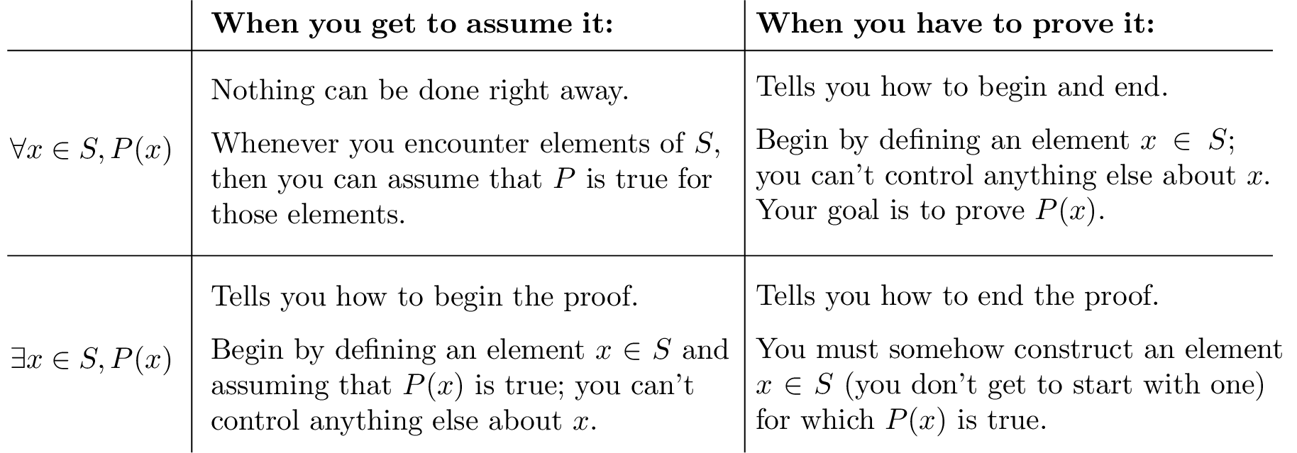 To give you an overview of the situation at a glance, Figure A.1 describes what happens to both types of quantifiers in both cases: when you assume them, and when you prove them. Since some cases are easier to deal with than others, you can try to change which case you have to deal with by changing your approach.