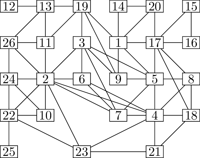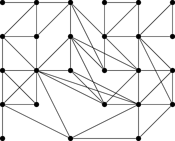 In fact, there is a second way to think about the problem that’s equally good. We could have defined two vertices to be adjacent if the tiles would not overlap: this graph would be the complement of the graph we originally defined. In the complement graph, a conflict-free solution corresponds to a clique: a set of vertices in which any two vertices are adjacent. Cliques and independent sets are both important; though the problems they solve are equivalent, as we see here, sometimes one is more natural than the other to think about, and sometimes we study the relationship between the two problems.