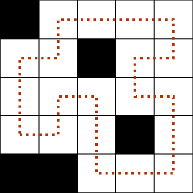 A pure loop puzzle, in which several squares of an \(n\times n\) grid are shaded, and the goal is to draw a closed loop through the unshaded squares that visits each of them exactly once. Such a puzzle and its solution are shown in the first diagram below.