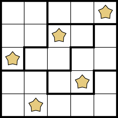 A star battle puzzle, in which an \(n\times n\) grid is divided into several regions, and a star must be placed in each region so that no two stars occupy the same row or column, and no two stars are adjacent even diagonally. Such a puzzle and its solution are shown in the second diagram above.