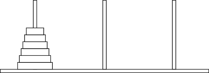 The Towers of Hanoi puzzle was invented in 1883 by Édouard Lucas [6]; it is now so popular its origins have been nearly forgotten. In this puzzle, you have three pegs, and some number of disks of different sizes stacked on the pegs. Initially, all the disks are placed on one peg, sorted by size (with the smallest disk on top), as shown in Figure 1.4.