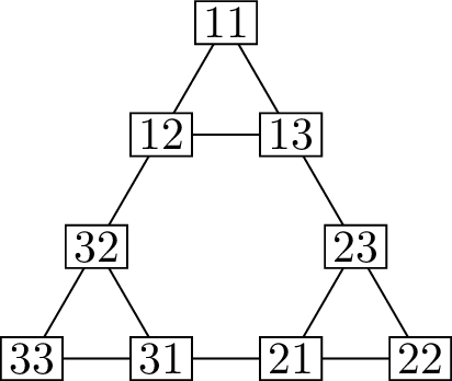 The vertices \(11\), \(22\), and \(33\) are the three vertices in which both disks are stacked on the same peg; we want to get from one of these to another.
