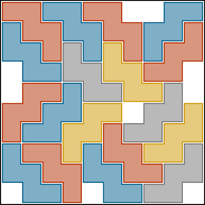 This is more of a puzzle than a graph-theoretical question: find a way to fit \(12\) zigzag-shaped tiles into an \(8\times 8\) grid with no overlaps. (How do we know that this is optimal without the use of a computer program?)