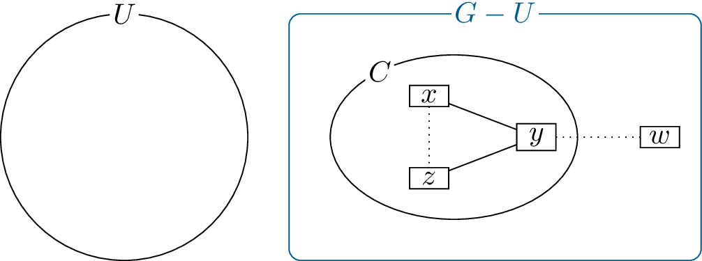 Suppose that some connected component \(C\) of \(G-U\) does not contain every edge it possibly could. Choose \(x \in V(C)\) such that not every vertex of \(C\) is adjacent to \(x\); let \(z\) be a vertex in \(C\) at distance \(2\) from \(x\), and let \(y\) be their common neighbor. Because \(x,y,z \notin U\), vertex \(y\) must not be adjacent to every vertex; there must be a fourth vertex \(w\) (potentially outside \(C\)) not adjacent to \(y\). This is illustrated in Figure 16.3.