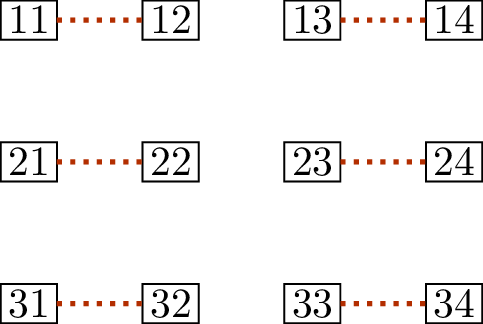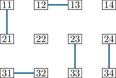 As a graph, \(M \oplus N\) (shown in Figure 14.2(c)) consists of four connected components. Two of them are just isolated vertices, and don’t have a lot to tell us. Another, with the vertices \(\{23,24,33,34\}\), is a cycle, and represents only that the matchings \(M\) and \(N\) match those four vertices in two different ways.