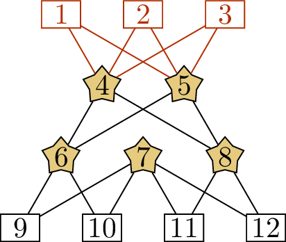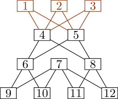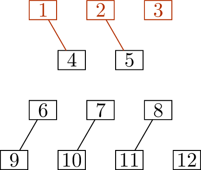 We have improved the matching, but we’re still not done, so we continue with another round of the algorithm. The edges of the new matching are \(\{\{1,4\}, \{2,5\}, \{6,9\}, \{7,10\}, \{8,11\}\}\), so the uncovered vertices are given by \(A_0 = \{3\}\) and \(B_0 = \{12\}\). Now we: