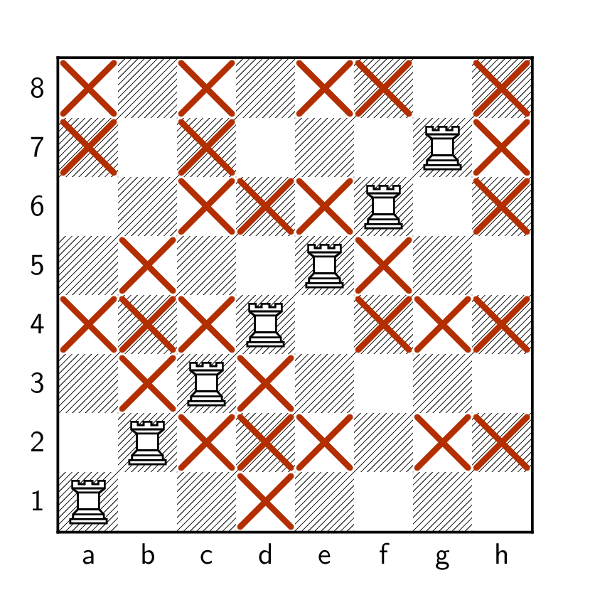 A \(7\)-rook solution is shown. Use the augmenting path algorithm to find either an \(8\)-rook solution, or a vertex cover proving that the \(7\)-rook solution is optimal.