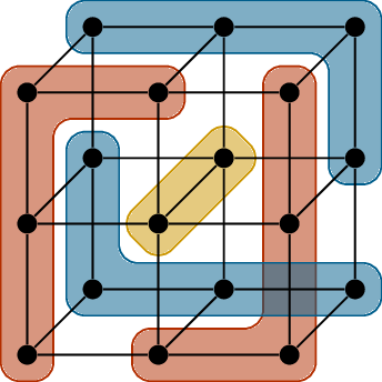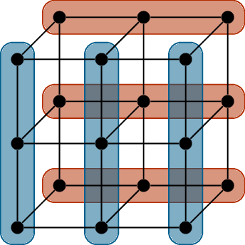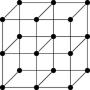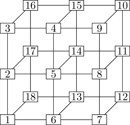 The graph in Figure 22.3(a) is a \(1 \times 2 \times 2\) three-dimensional grid graph. In general, the \(a \times b \times c\) grid graph has vertices which are \(3\)-dimensional points \((x_1, x_2, x_3)\) with \(x_1 \in \{1,2,\dots,a\}\), \(x_2 \in \{1,2,\dots,b\}\), and \(x_3 \in \{1,2,\dots,c\}\); two vertices are adjacent if they are at distance \(1\) from each other. Thinking of Figure 22.3(a) as a \(3\)-dimensional drawing can give you an idea of what an \(a\times b\times c\) grid graph looks like.