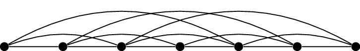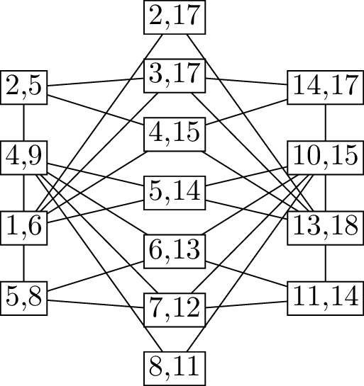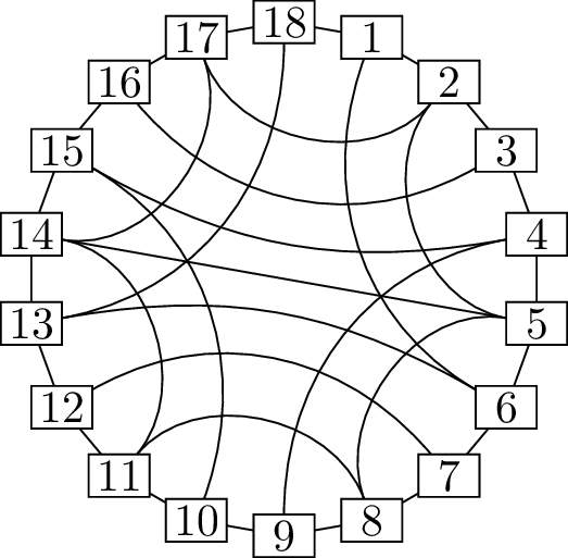 The decisions that we make for different fragments are not entirely independent. For example, edge \(\{1,6\}\) and edge \(\{2,17\}\) would intersect if we drew them both inside the Hamilton cycle, or both outside. To keep track of this information, we define a new graph, called the overlap graph of the cycle \(C\). Its vertices are fragments, and they are adjacent if they “overlap”: if they cannot be drawn on the same side of \(C\).