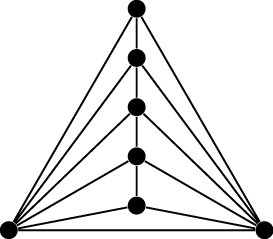 Now that we’ve understood these extremal examples, we give them a name, based on the fact that all of their faces are (in some sense) triangles. We call a plane embedding of a connected graph in which all faces have length \(3\) a triangulation. For each \(n\), there are many \(n\)-vertex triangulations; see Figure 22.1 for some examples when \(n=7\). (These are all the \(7\)-vertex possibilities, up to isomorphism of the planar graph. I know this because I first looked up sequence A000109 [79] in the Online Encyclopedia of Integer Sequences to confirm there are \(5\) of them, then searched the House of Graphs [20] to find out what they are.)
