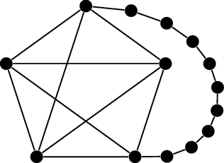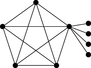Thus far, the graphs \(K_{3,3}\) and \(K_5\) have not been planar because they have too many edges. It is easy, but not very exciting, to find more graphs that are not planar, simply because they have a copy of \(K_{3,3}\) or \(K_5\) inside them. Figure 22.2(b) shows an example of this. We’ve added several vertices and edges to \(K_5\); the result is even connected. However, the extra vertices and edges aren’t really contributing anything to the non-planarity; the only reason that the resulting graph is not planar is because it contains a copy of \(K_5\) inside it.